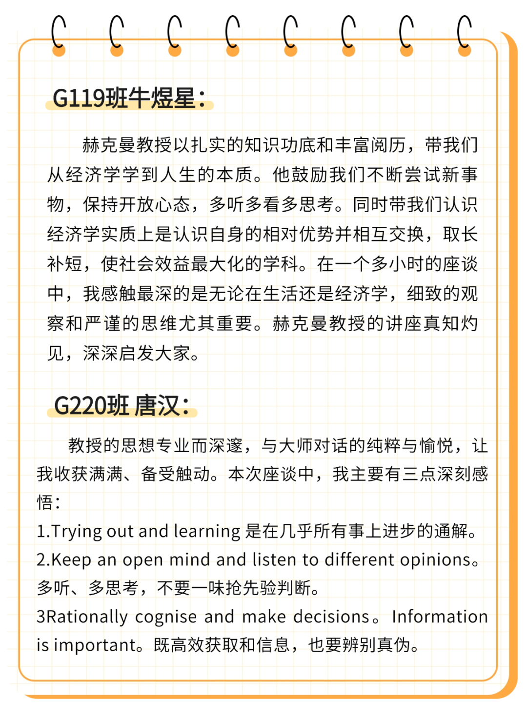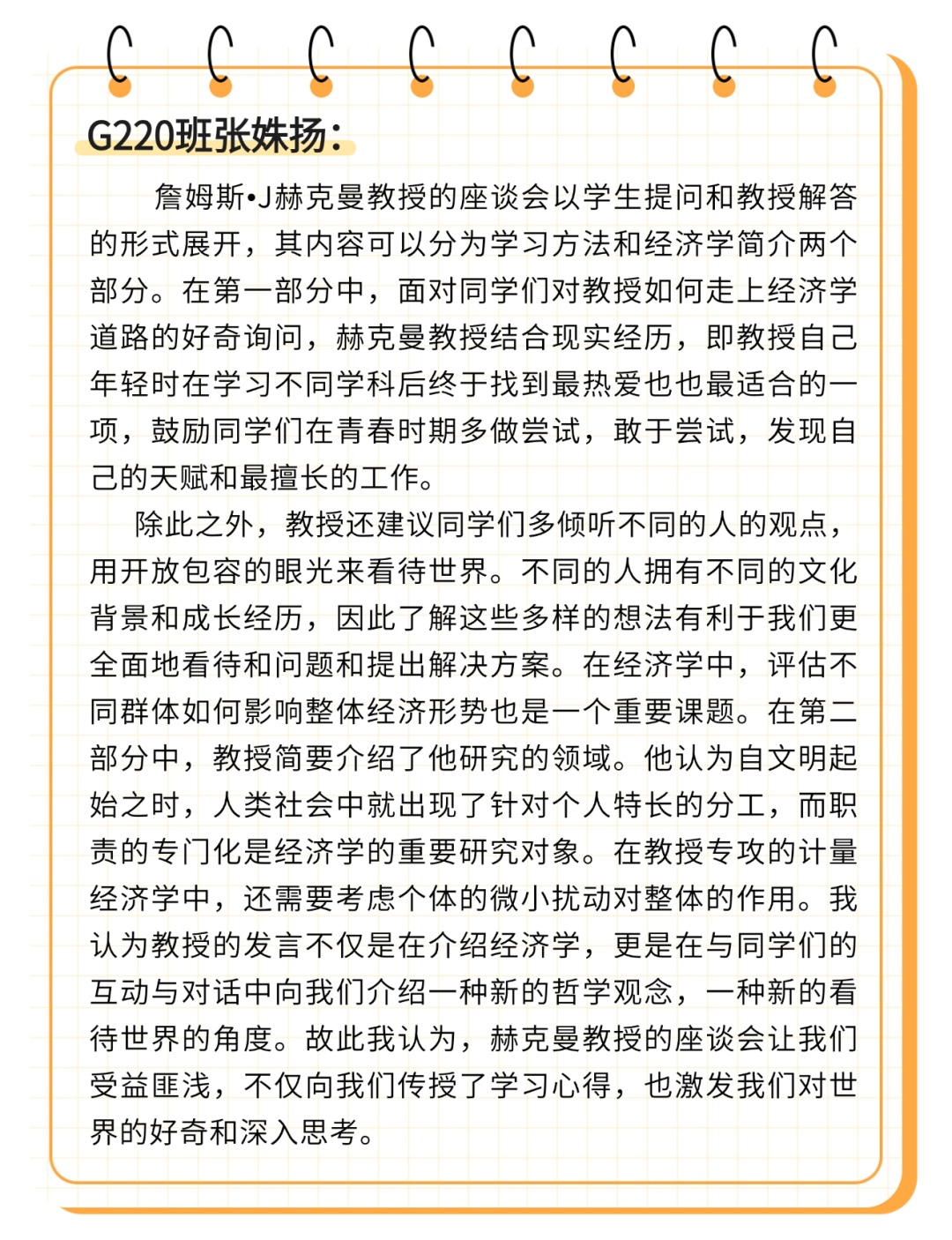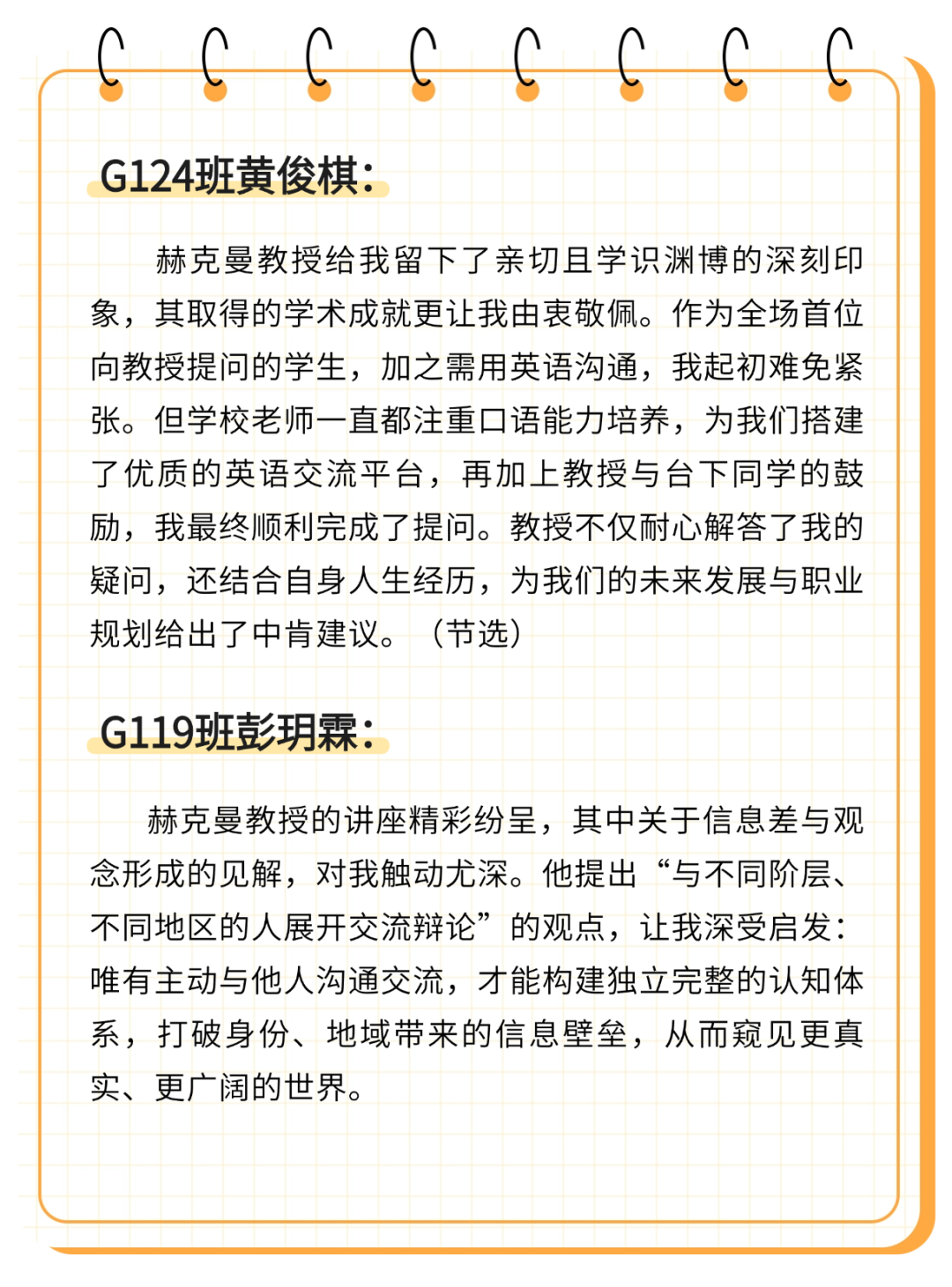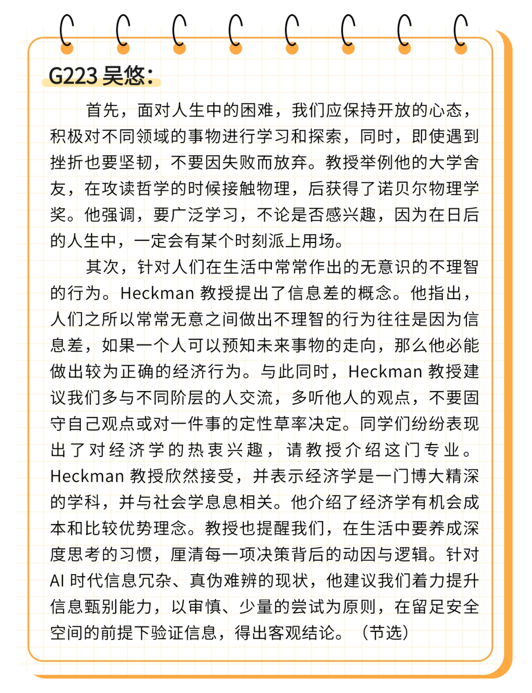 赫克曼教授还以自身经历寄语学子,他坦言自己从未有过“完美规划”的人生路径,他以前做过多种工作,与不同背景的人交流学习,这些经历都成为了日后理解世界的素材。